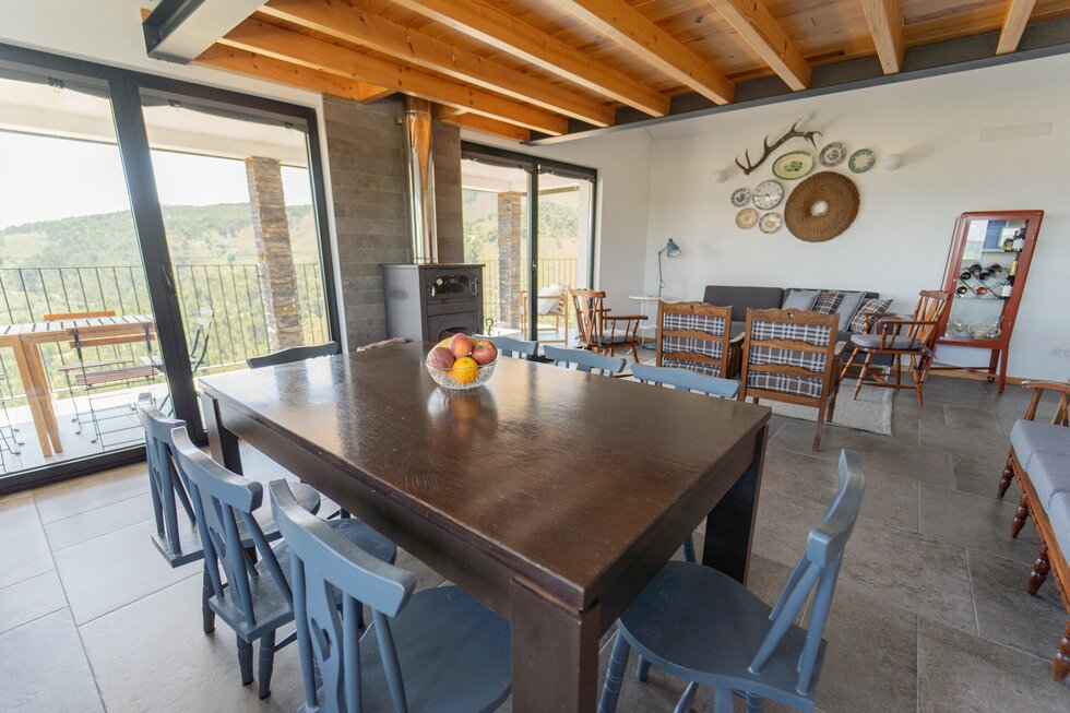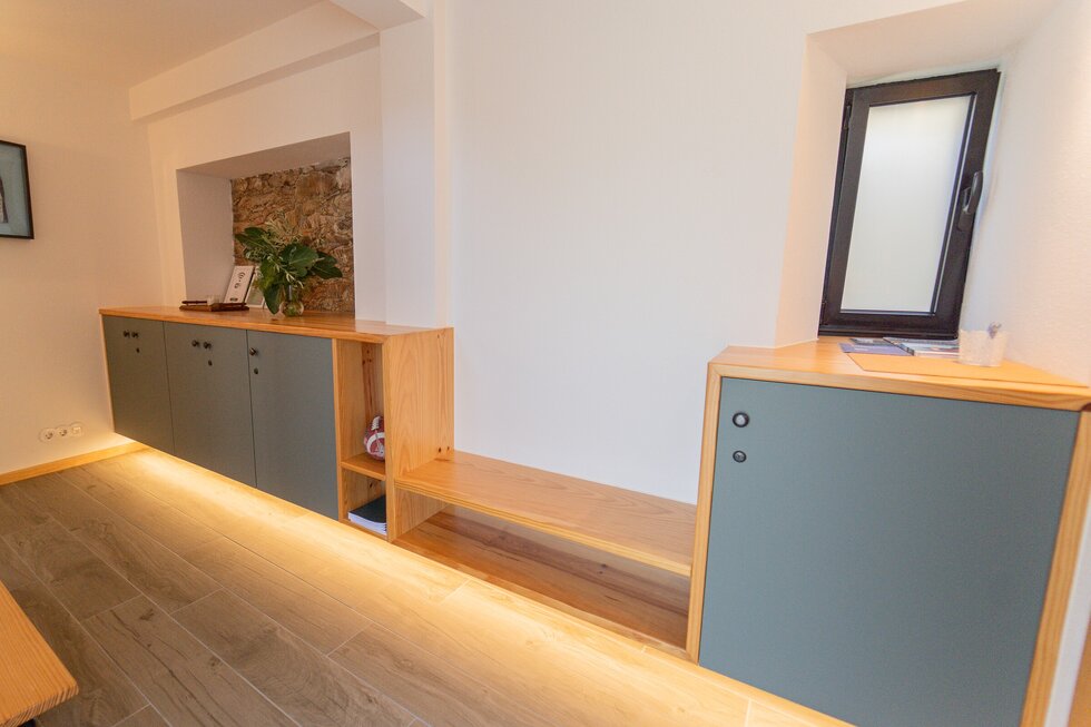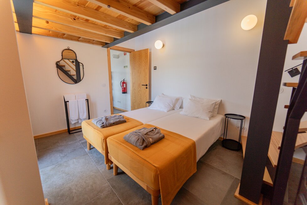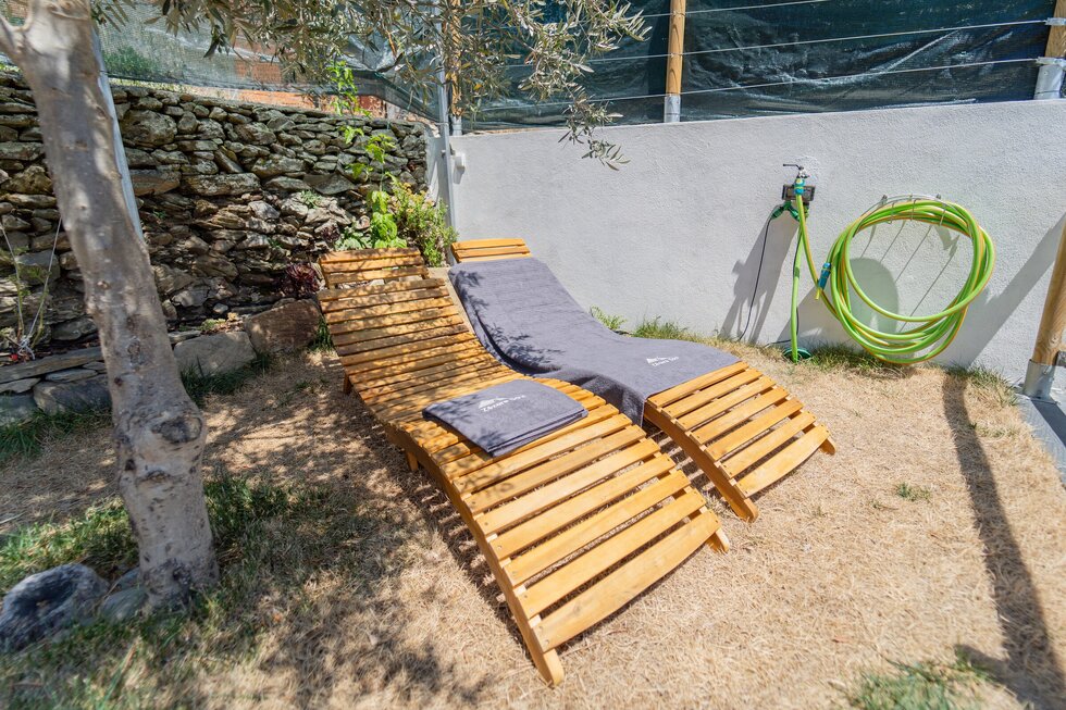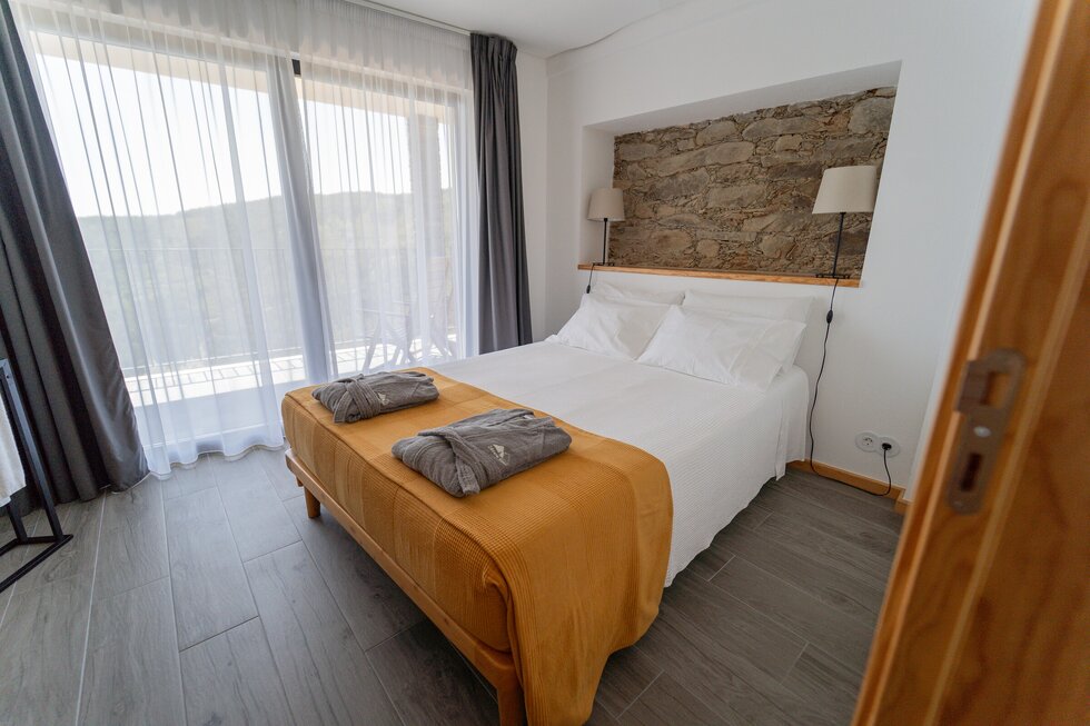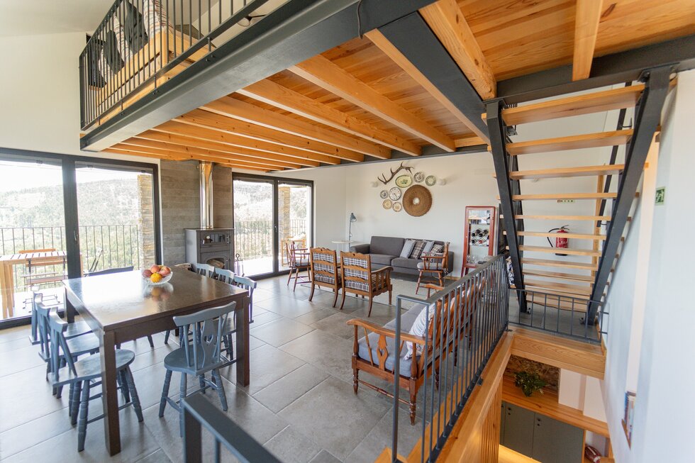 A casa é nova, mas com a memória dos nossos antepassados impressa em cada detalhe. O calor da salamandra com o forno para assar as castanhas no inverno é como em abraço dos nossos avós. O apontamento dos barrotes nus com o sobrado de madeira, o ferro simples e despojado, e por fim o xisto, são a alma desta casa.