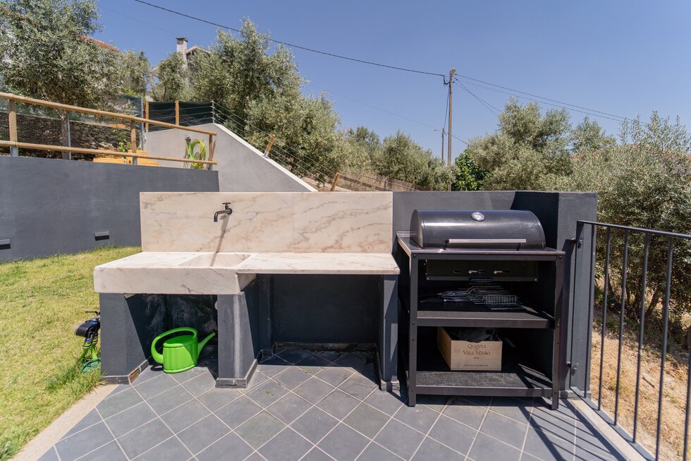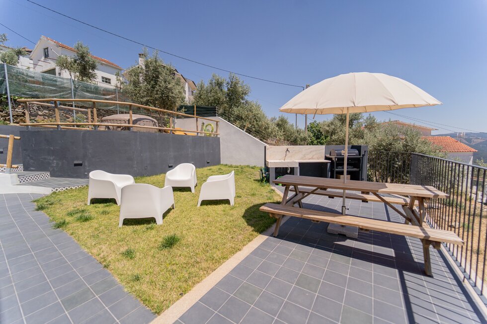 Zona de churrasco com zona de refeições exterior; relvado com zona de estar; jacuzzi aquecido e espreguiçadeiras.