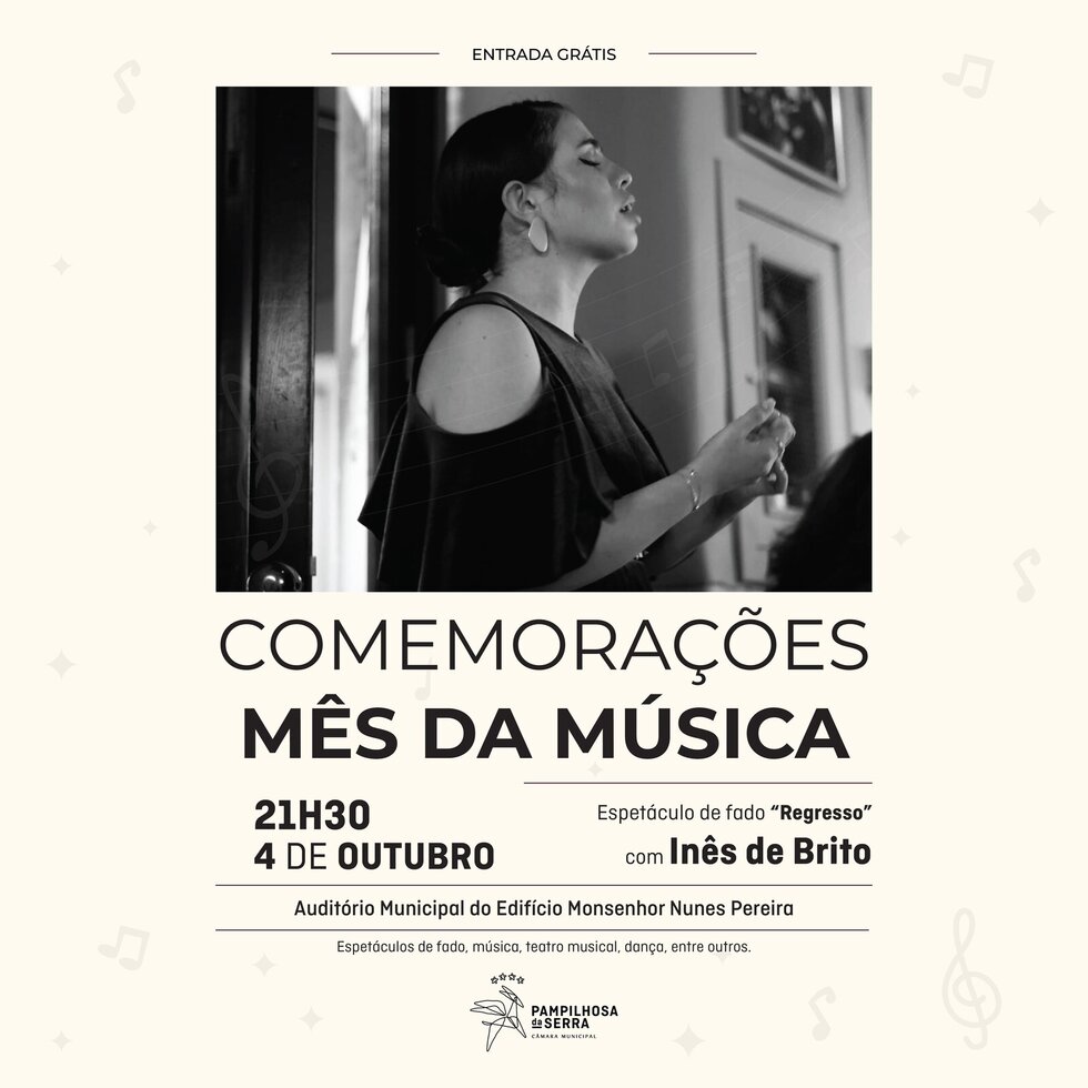 Outubro é o “Mês da Música” e o Município vai assinalar a ocasião com um conjunto de espetáculos de música, teatro ou dança. O primeiro realiza-se já na próxima sexta-feira, dia 4 de outubro, com o concerto de fado "Regresso", cantado e sentido pela talentosa Inês de Brito.