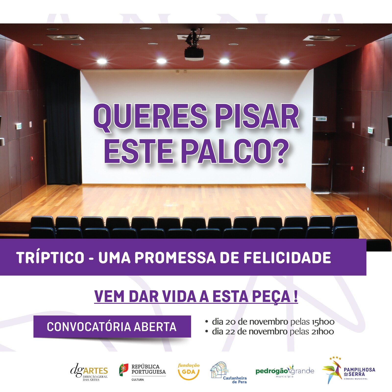 Nos dias 20 e 22 de novembro, participe na convocatória aberta que visa recrutar participantes do concelho de Pampilhosa da Serra, para interpretar uma peça do projeto “Tríptico – Uma Promessa de Felicidade”.