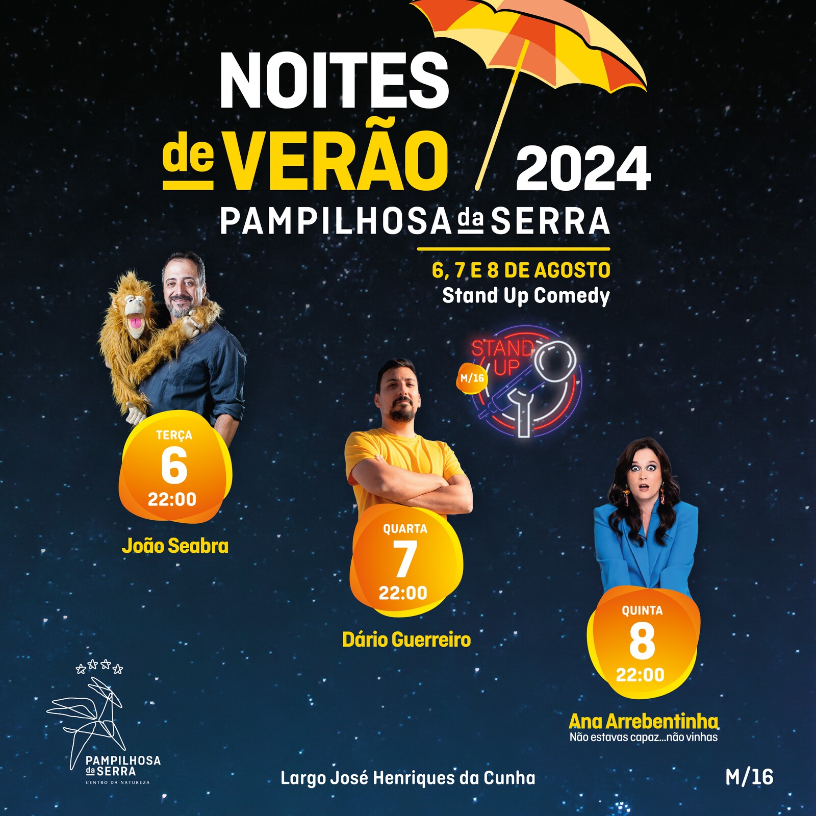 João Seabra, Dário Guerreiro e Ana Arrebentinha são os carismáticos humoristas que vão animar as noites de 6, 7 e 8 de agosto, respetivamente, no Largo José Henriques da Cunha, na Vila de Pampilhosa da Serra.