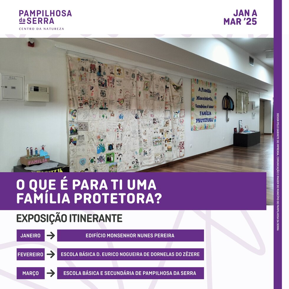 “O que é para ti uma família protetora…” esteve patente no Edifício Monsenhor Nunes Pereira ao longo do mês de janeiro. Durante fevereiro estará na Escola Básica D. Eurico Dias Nogueira, em Dornelas do Zêzere, terminando a sua itinerância na Escola Básica e Secundária de Pampilhosa da Serra, no mês de março.