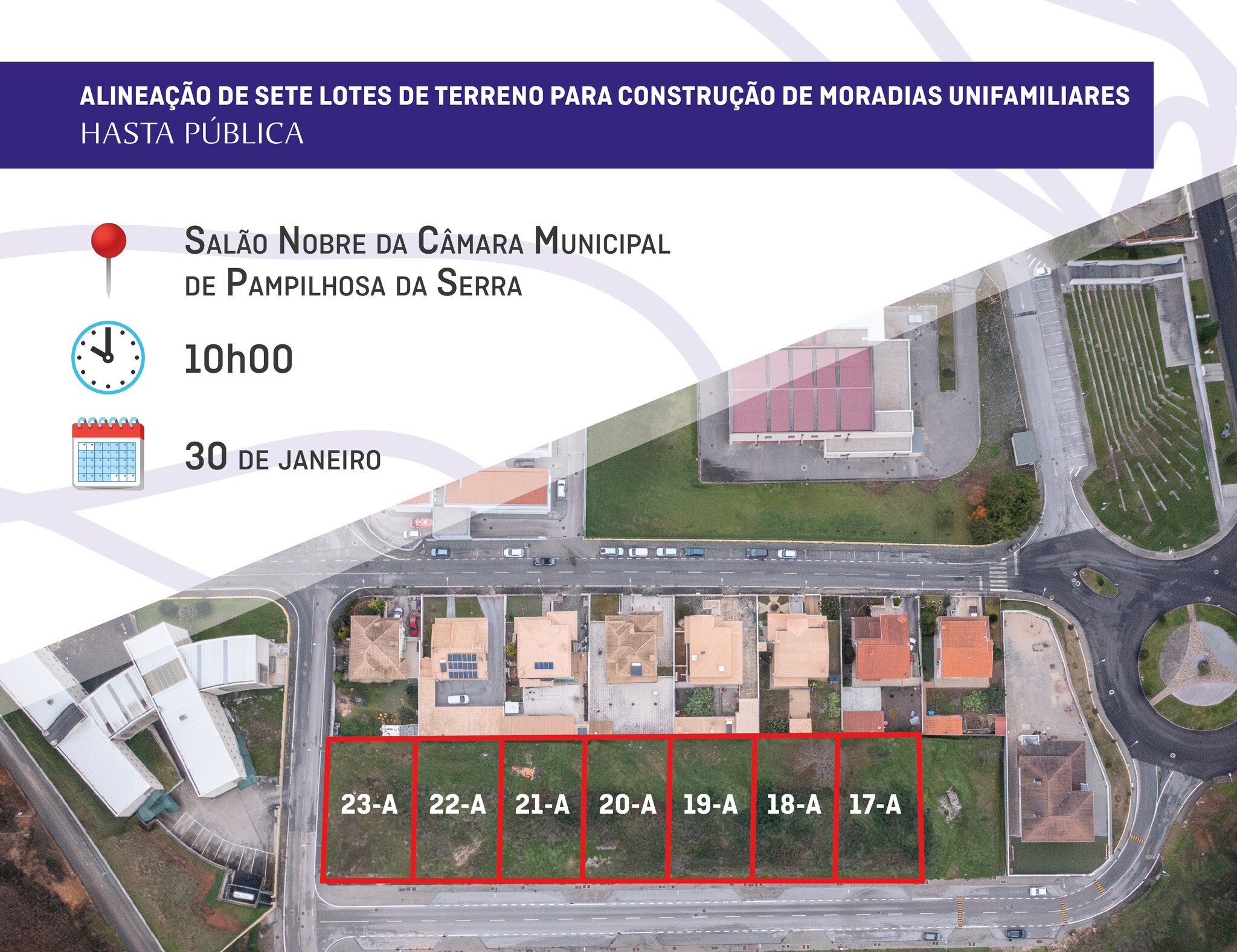 Realiza-se, no próximo dia 30 de janeiro, pelas 10h00, no Salão Nobre da Câmara Municipal, o Procedimento de Hasta Pública para Alienação de Sete Lotes de Terreno para Construção de Moradias Unifamiliares, situado na Urbanização da Quinta de São Martinho, Vila de Pampilhosa da Serra.