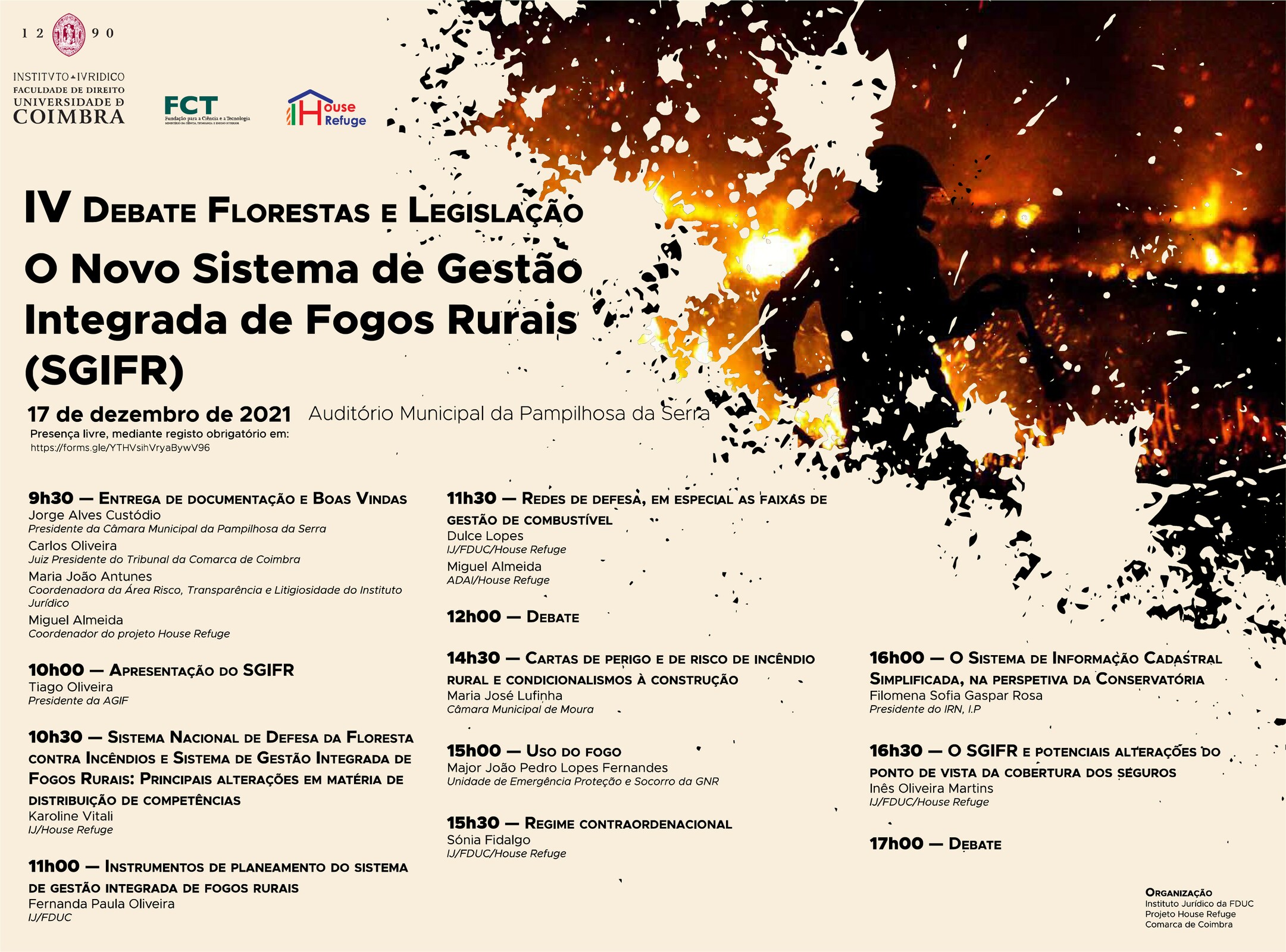 Na próxima sexta-feira, dia 17 de dezembro, o Auditório Municipal de Pampilhosa da Serra acolhe o IV Debate Florestas e Legislação – O Novo Sistema de Gestão Integrada de Fogos Rurais. Este é um evento organizado anualmente pelo Instituto Jurídico da Faculdade de Direito da Universidade de Coimbra, com a coordenação científica das Professoras Doutoras Maria João Antunes e Dulce Lopes.
