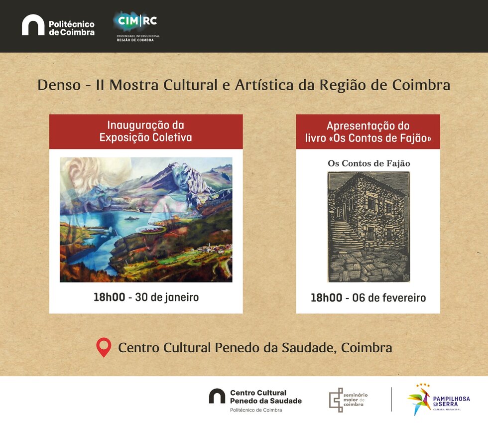 O Centro Cultural Penedo da Saudade, do Instituto Politécnico de Coimbra (IPC), será o palco da segunda edição da DENSO – II Mostra Cultural e Artística da Região de Coimbra | Exposição Cultural e Artística, de 30 de janeiro a 03 de março. Trata-se de uma iniciativa conjunta do IPC e da CIMRC, em colaboração com os 19 Municípios que compõem a Comunidade Intermunicipal da Região de Coimbra e que procura promover a riqueza e diversidade cultural dos seus territórios, através de uma exposição de obras artísticas de escultura, pintura e fotografia. Paralelamente à exposição, decorrerão vários eventos, como conversas, concertos, exposições, oficinas e apresentação de livros.