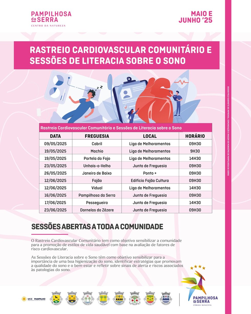 Torne o seu sono e o seu coração uma prioridade! De 9 de maio a 23 de junho, a saúde vai ao encontro da comunidade em todas as 8 freguesias do concelho de Pampilhosa da Serra, através de uma iniciativa que alia prevenção, conhecimento e bem-estar.
