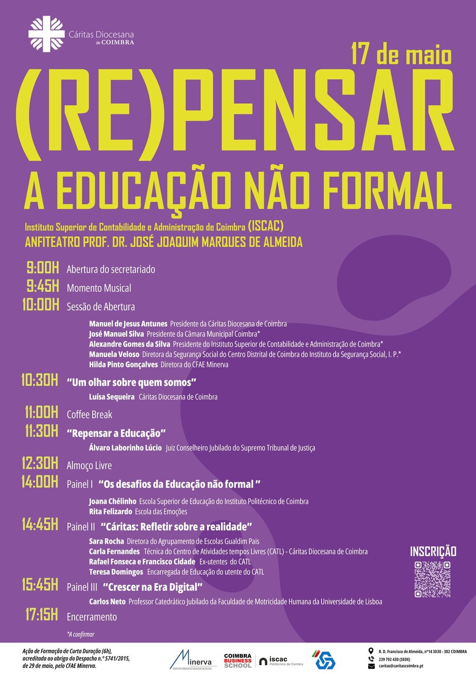 Seminário «(Re)pensar a Educação não formal»A Cáritas Diocesana de Coimbra, através da equipa de Diretores Técnicos da resposta social Centros de Atividades de Tempos Livres (CATL), irá realizar, no próximo dia 17 de maio, o seminário “(Re)pensar a Educação não formal”, no Instituto Superior de Contabilidade e Administração de Coimbra (ISCAC), em Coimbra. Este seminário pretende promover a reflexão, junto dos profissionais da área da educação, sobre os novos desafios da educação não formal. Neste evento está já confirmada a presença, entre outras, do Dr. Laborinho Lúcio e do Professor Carlos Neto.