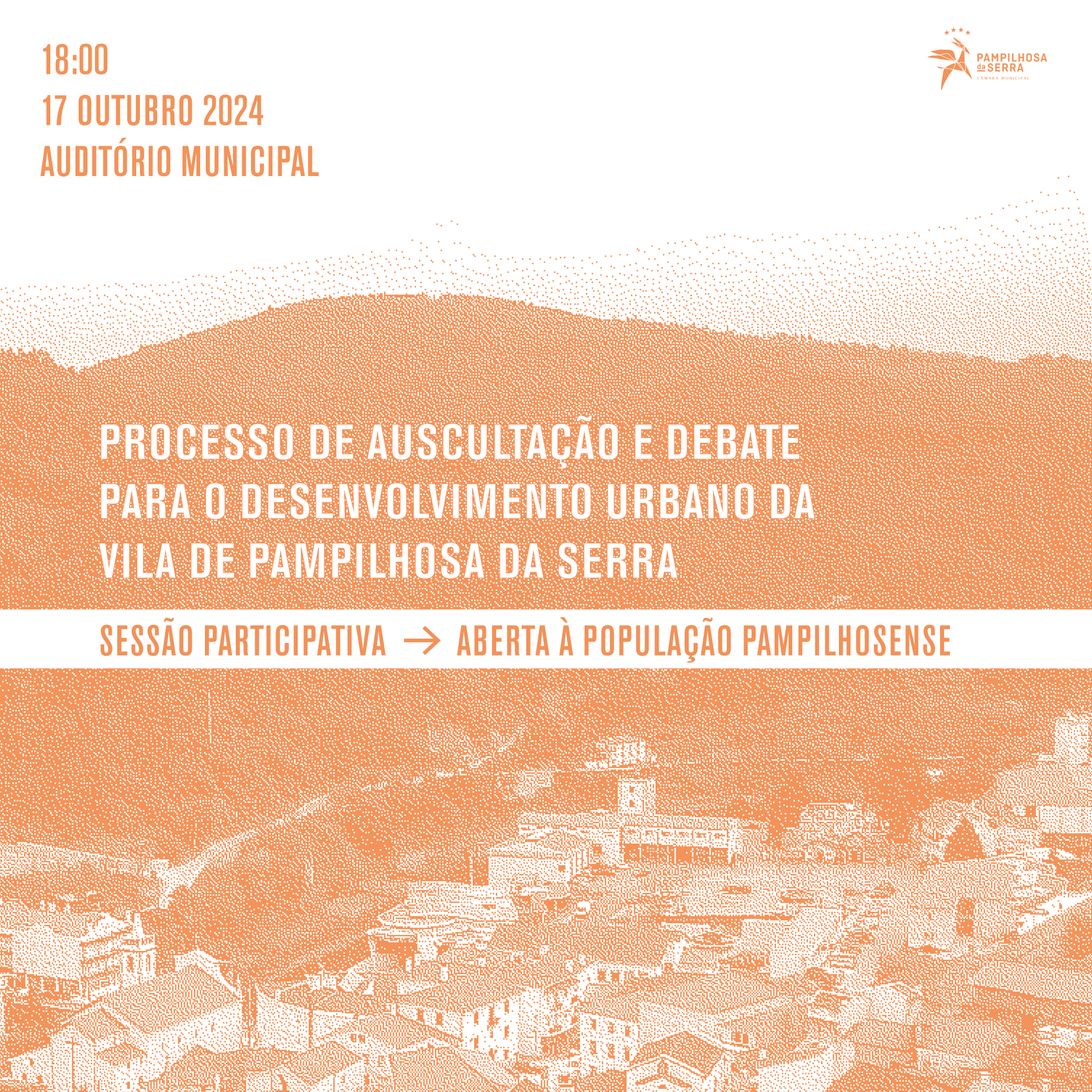 No dia 17 de outubro, pelas 18h00, decorrerá a 2ª sessão pública participativa, no âmbito do processo de auscultação e debate para o Estudo de Desenvolvimento Urbano da Vila de Pampilhosa da Serra.