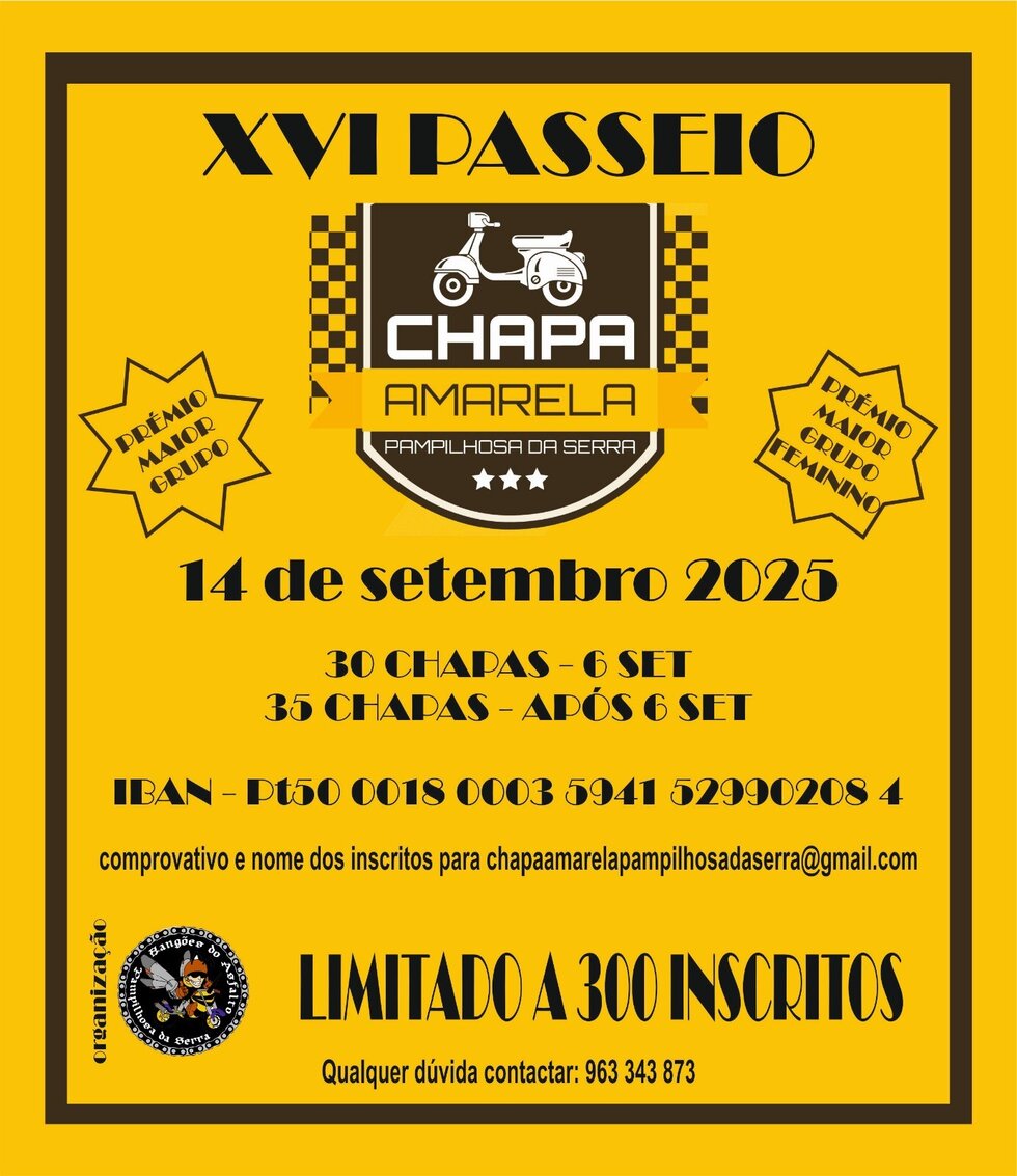 O XVI Passeio da Chapa Amarela conta com o apoio da Câmara Municipal de Pampilhosa da Serra e reafirma-se como um momento de encontro e celebração em torno da paixão pelas motorizadas, projetando o concelho como palco de um evento singular, que combina a beleza da região com a energia e entusiasmo dos participantes.