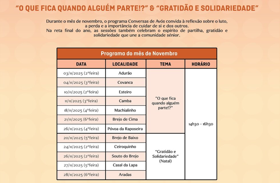Até ao final do mês há novas paragens e novas conversas, num percurso afetivo que volta a unir a comunidade em torno da partilha, da escuta e da valorização da experiência sénior. O programa “Conversas de Avós” percorrerá várias localidades do concelho de Pampilhosa da Serra com duas sessões especialmente significativas: