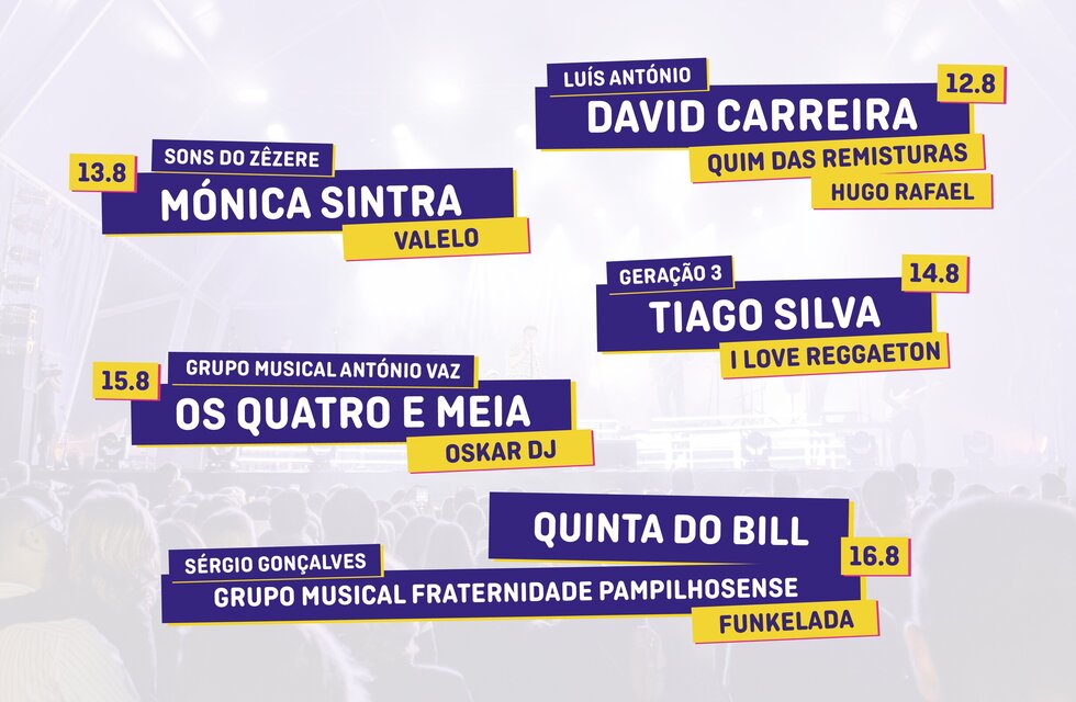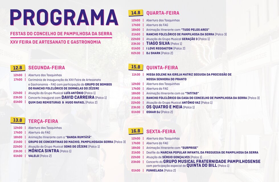 Pampilhosa é orgulhosamente da Serra e espera por si nas Festas do Concelho! De 12 a 16 de agosto, celebre a amizade e a tradição, à boa moda serrana e ao som dos melhores artistas nacionais. Prove deliciosas iguarias nas tasquinhas, visite talentosos expositores e divirta-se nos bailaricos ou noite dentro ao ritmo de conceituados DJ’s.