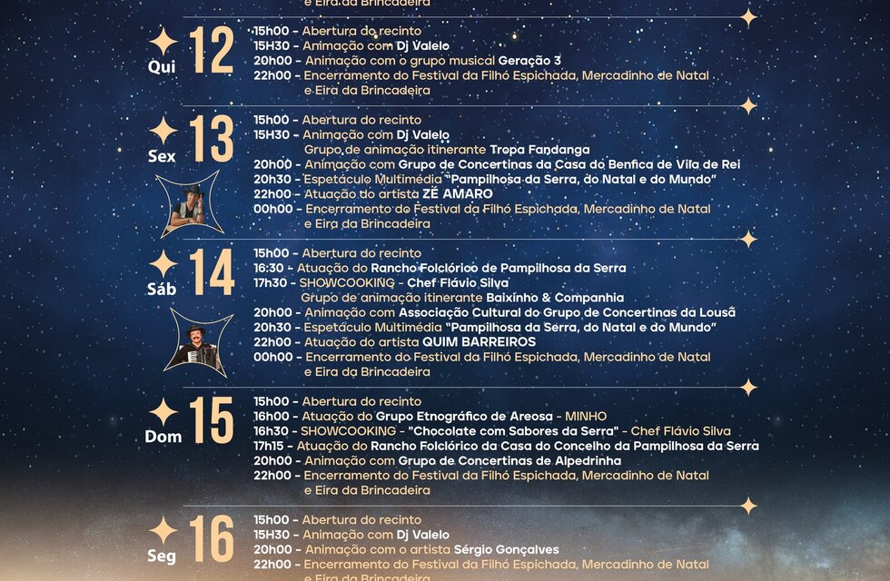 De 11 a 22 de dezembro, deixe-se guiar pela magia de outros tempos e venha saborear e sentir o tradicional Natal Serrano! Ao longo de 12 dias, no Mercado Municipal de Pampilhosa da Serra, o evento celebra o mais genuíno espírito de Natal, num ambiente acolhedor e de animação contagiante e constante.