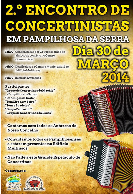 Vai realizar-se no próximo dia 30 de março, a partir das 14h00, o 2.º encontro de Concertinas em Pampilhosa da Serra, uma organização do Grupo de Concertinas do Machio em parceria com a Câmara Municipal de Pampilhosa da Serra.