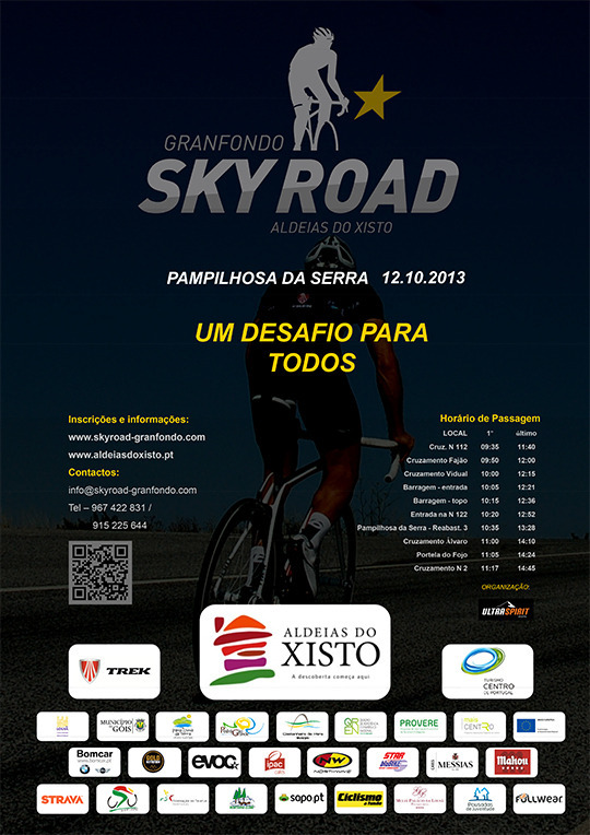 "SKY ROAD Aldeias do Xisto" é um evento de bicicleta de estrada, vocacionado para todos os praticantes de ciclismo e cicloturismo. É uma prova de resistência, dada a sua distância e o seu desnível acumulado, simulando uma etapa de montanha de uma qualquer grande volta ciclista (Tour de France, Vuelta a España ou Volta a Portugal). A base deste evento do tipo "Granfondo" em cenário de montanha, que a ULTRA-SPIRIT ® sports trouxe para Portugal é a de proporcionar a todos os atletas a experiência de viver as sensações de uma verdadeira etapa de montanha, enquadrados por uma logística à altura dessa experiência.
