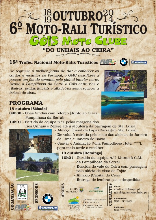 Com a organização do Góis Moto Clube e com o forte apoio dos autarcas locais, este passeio turístico irá percorrer ao longo destes dois dias alguns dos locais mais emblemáticos do concelho de Pampilhosa da Serra, dando a oportunidade aos motociclistas de parar e fotografar os pontos de maior interesse.