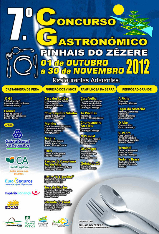 O 7.º CONCURSO GASTRONÓMICO PINHAIS DO ZÊZERE decorre de 1 de outubro a 30 de novembro, com a participação de 23 Restaurantes, distribuídos pelos concelhos de Pampilhosa da Serra, Castanheira de Pêra, Figueiró dos Vinhos e Pedrógão Grande.