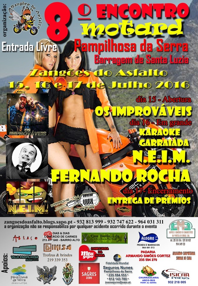 Vai realizar-se nos próximos dias 15,16 e 17 de julho o 8.º Encontro Motard em Pampilhosa da Serra. Um evento organizado pelos Zangões do Asfalto que decorrerá em Casal da Lapa, junto à Barragem de Santa Luzia.