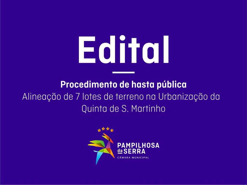 A Câmara Municipal de Pampilhosa da Serra recorda que está aberto o procedimento de hasta pública, com prévia apresentação de candidaturas, para a alienação de sete lotes de terreno, localizados na Urbanização da Quinta de S.Martinho, na Vila de Pampilhosa da Serra, sendo estes destinados à construção, pelos respetivos adquirentes, da sua habitação própria e permanente.