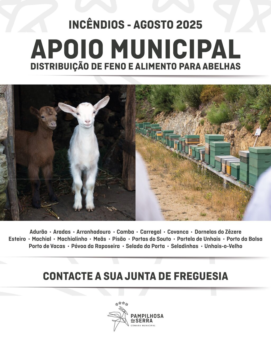 Na sequência do incêndio que atingiu o concelho nos últimos dias, a Câmara Municipal, em articulação com as Juntas de Freguesia, irá proceder à pronta distribuição de feno e alimento para abelhas, destinados a apoiar os munícipes que registaram prejuízos nesta área.