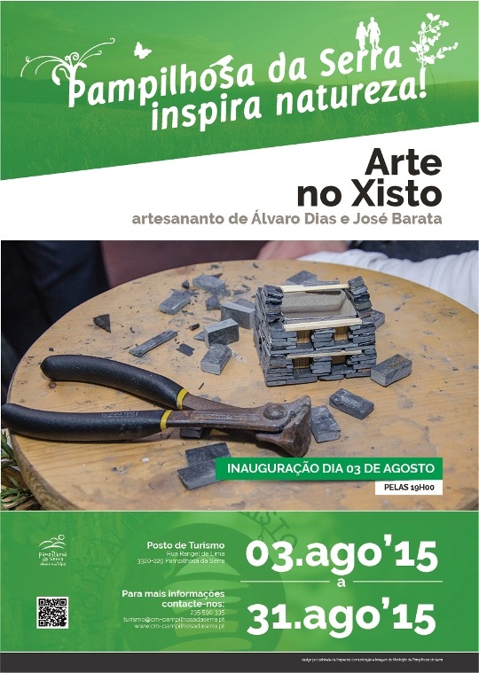 Intitulada «Arte no Xisto» esta exposição vai contar com trabalhos dos artesãos locais Álvaro Dias e José Barata. Estes artistas vão apresentar uma variedade de peças minuciosamente trabalhadas em xisto, das quais se realçam as miniaturas de casas em xisto representativas das originais, que podem ser encontradas pelo concelho da Pampilhosa da Serra.