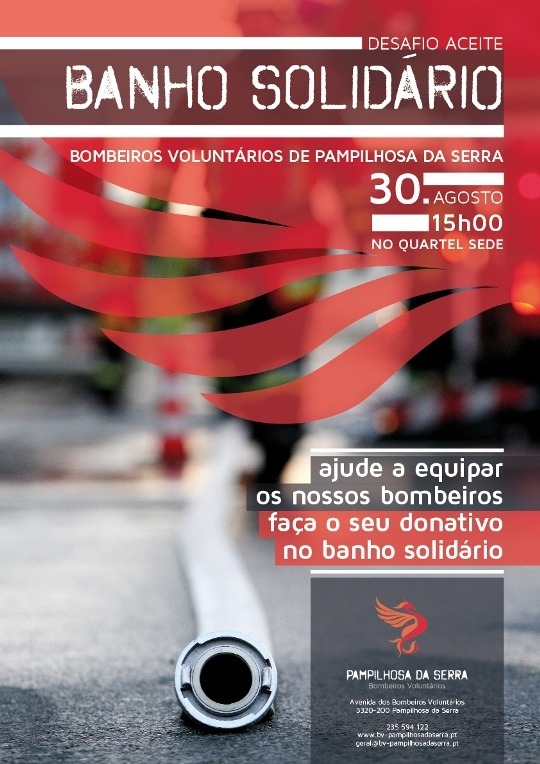 Na sequência do desafio lançado pela Corporação de Bombeiros de Algueirão-Mem Martins, os Bombeiros Voluntários de Pampilhosa da Serra aceitaram o repto e irão realizar o banho solidário, aberto a toda a população, no dia 30 de agosto pelas 15h00, junto ao quartel dos bombeiros.