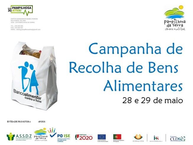 Num período em que as debilidades económicas tornam imperativo o aumento de respostas sociais, o Município de Pampilhosa da Serra e o CLDS – Pampilhosa Ativa em colaboração com o Banco Alimentar, realiza nos dias 28 e 29 de maio, uma campanha solidária de recolha de bens alimentares nos supermercados locais, nomeadamente “Meu-Super”, “MaxiGrula” e “Mini-Preço”.