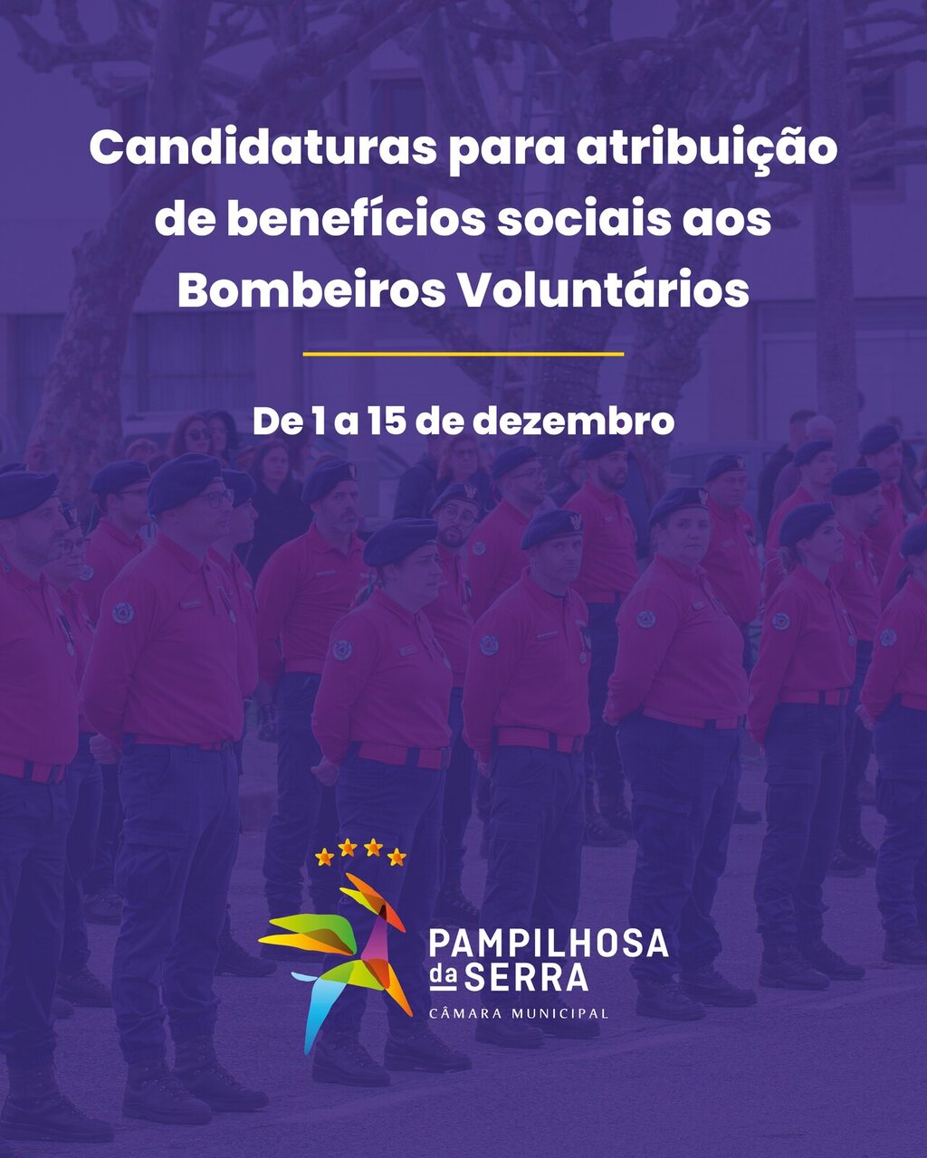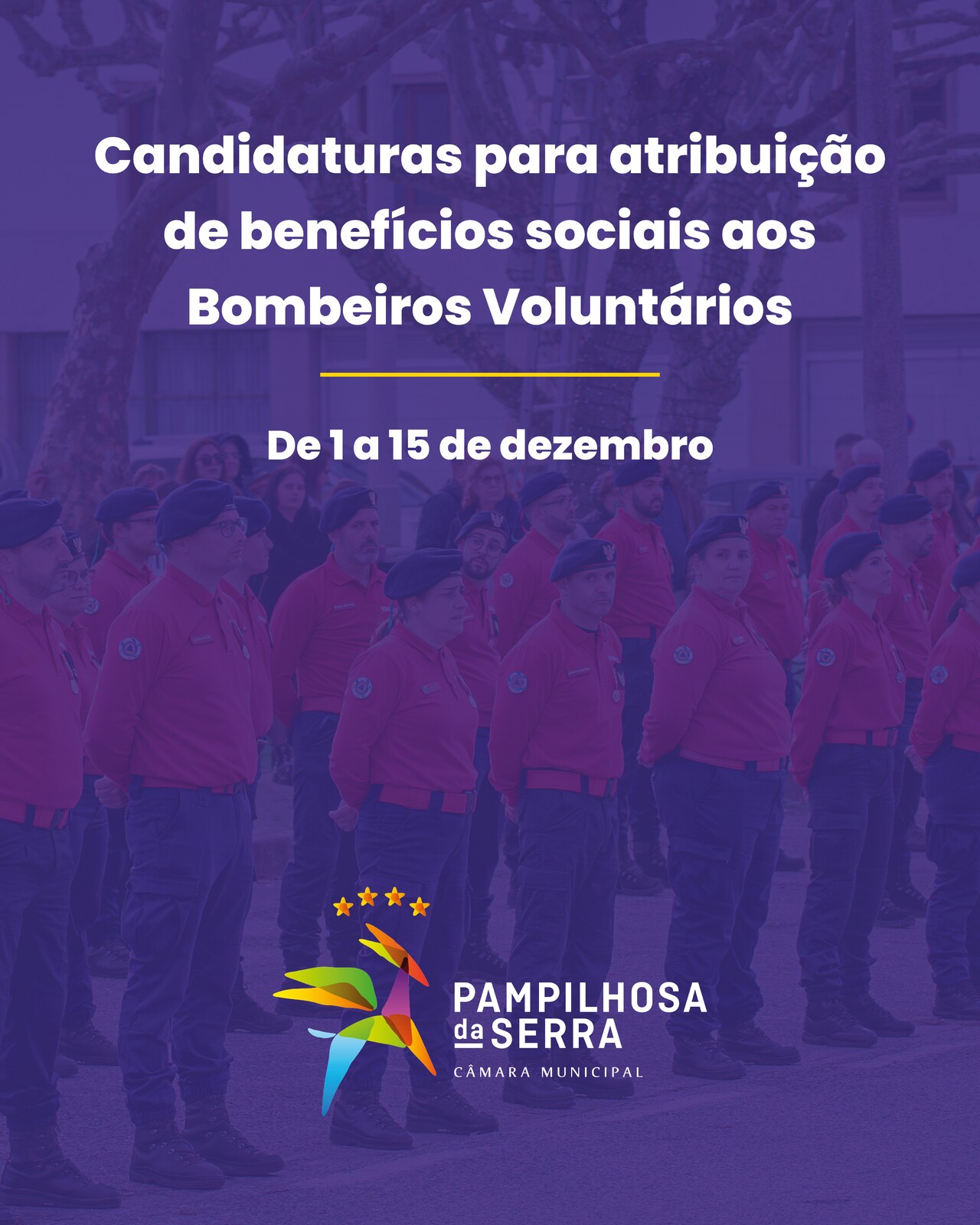 A Câmara Municipal recorda que, a partir do dia 1 e até ao dia 15 de dezembro, os elementos dos corpos ativos e de comando dos Bombeiros Voluntários de Pampilhosa da Serra (BVPS) podem solicitar a atribuição de benefícios sociais concedidos pelo Município.