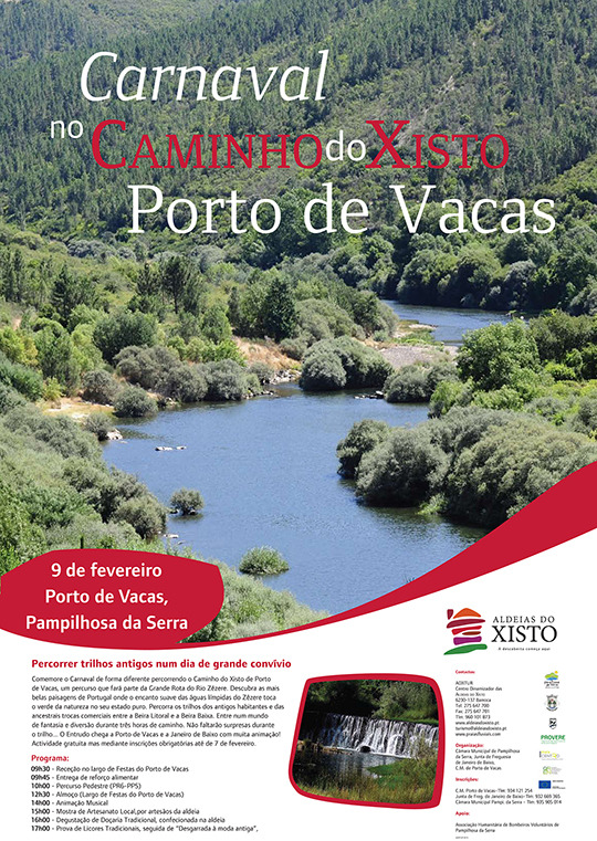 Comemore o Carnaval de forma diferente percorrendo o Caminho do Xisto de Porto de Vacas, um dos seis da rede de Percursos Pedestres do concelho de Pampilhosa da Serra. Descubra as mais belas paisagens de Portugal onde o encanto suave das águas límpidas do Zêzere toca o verde da natureza no seu estado puro. Percorra os trilhos dos antigos habitantes e das ancestrais trocas comerciais entre a Beira Litoral e a Beira Baixa. Entre num mundo de fantasia e diversão durante três horas de caminho. Não faltarão surpresas durante o trilho... O Entrudo chega a Porto de Vacas e à Freguesia de Janeiro de Baixo com muita animação!