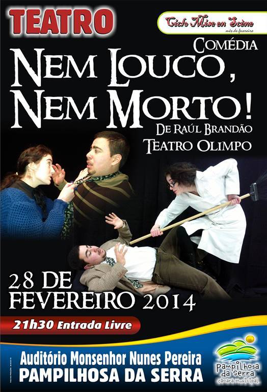 No próximo dia 28 de fevereiro, pelas 21h30, o Auditório Municipal do Edifício Monsenhor Nunes Pereira vai receber a comédia "Nem Louco, Nem Morto!", da autoria do Teatro Olimpo. Esta peça insere-se no Ciclo Mise en Scène.