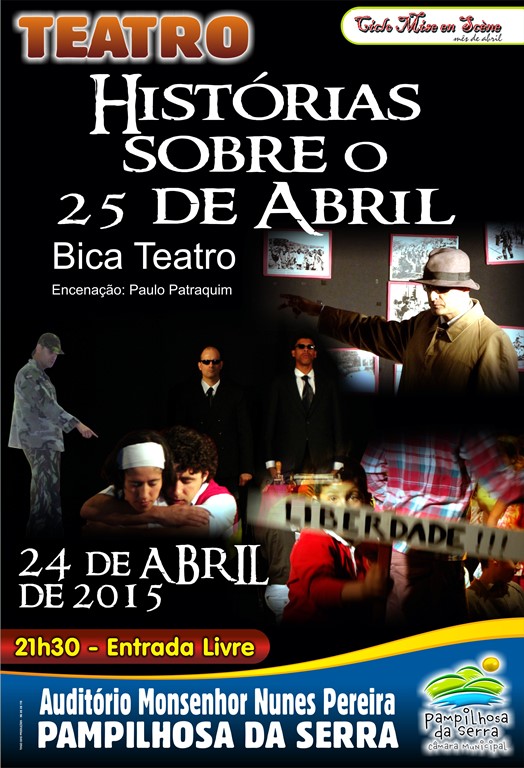 "Histórias sobre o 25 de abril" do Grupo "Bica Teatro", é a peça de teatro que sobe ao palco do Auditório Municipal, no próximo dia 24 de abril pelas 21h30. Esta peça insere-se no Ciclo Mise en Scène e tem entrada livre.