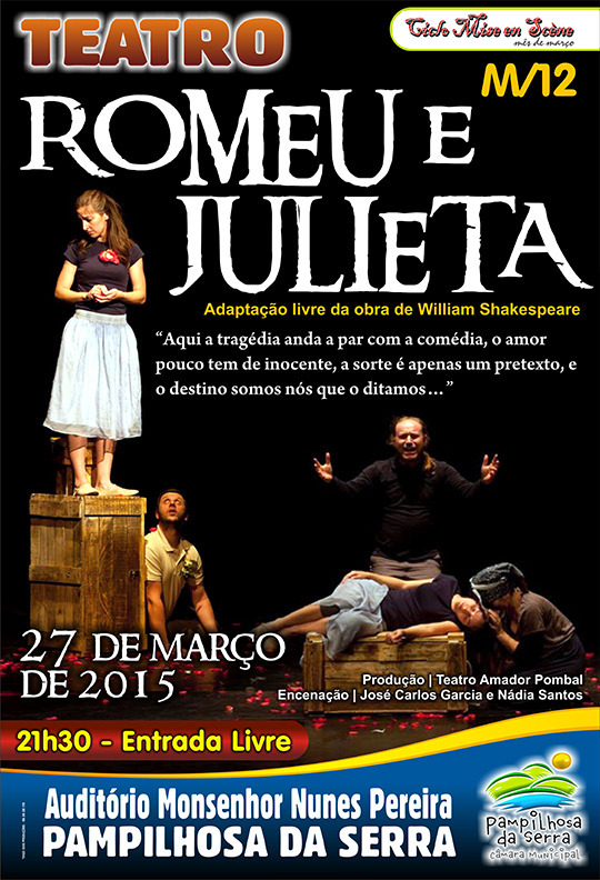 No próximo dia 27 de março o Município de Pampilhosa da Serra celebra o Dia Mundial do Teatro com "Romeu e Julieta", uma produção do TAP - Teatro Amador de Pombal. Inserida no Ciclo de Teatro "Mise en Scène", esta peça realiza-se no Auditório Monsenhor Nunes Pereiras, pelas 21h30 e tem entrada livre.