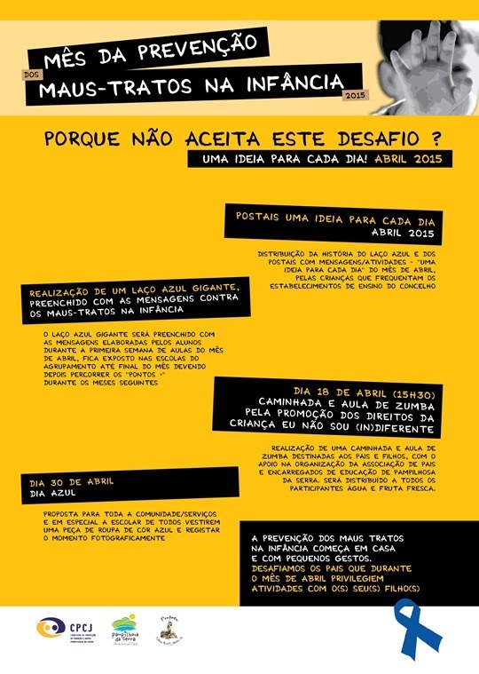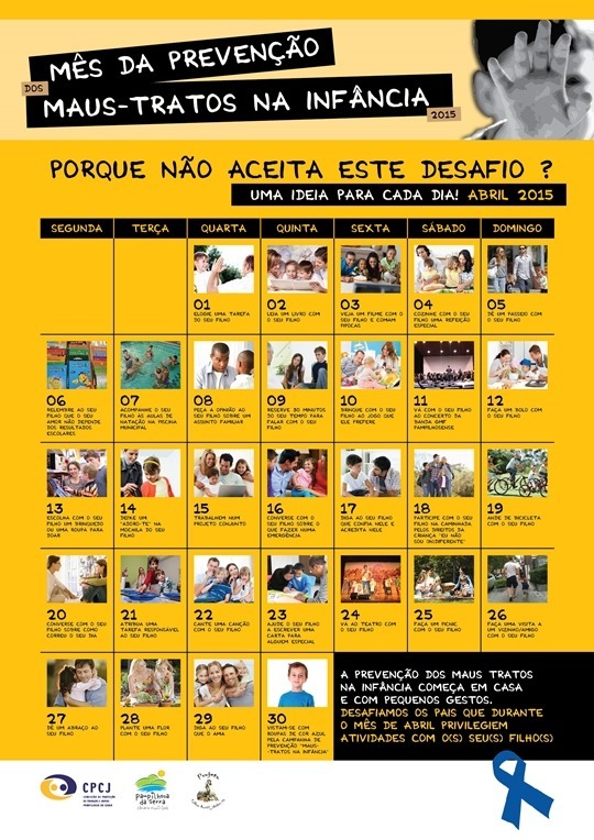 Tendo por tema o "Mês de Abril: Mês da Prevenção dos Maus Tratos na Infância" e numa iniciativa conjunta entre a Comissão de Proteção de Crianças e Jovens (CPCJ) de Pampilhosa da Serra, o Agrupamento de Escolas Escalada, Pampilhosa da Serra (GAAF - Gabinete Apoio ao Aluno e Família - voluntários e representantes das turmas), o Projeto Trilhos Rur@l_idades e a Associação de Pais e Encarregados de Educação de Pampilhosa da Serra, vão ser dinamizadas atividades que fazem parte da campanha de prevenção dos maus tratos na infância.