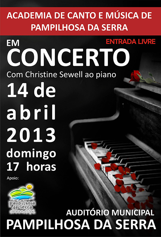 A Academia de Canto e Música de Pampilhosa da Serra tem o prazer de atuar em concerto, no próximo dia 14 de abril, pelas 17h00, no Auditório Municipal, com a participação de Christine Sewell ao piano.
