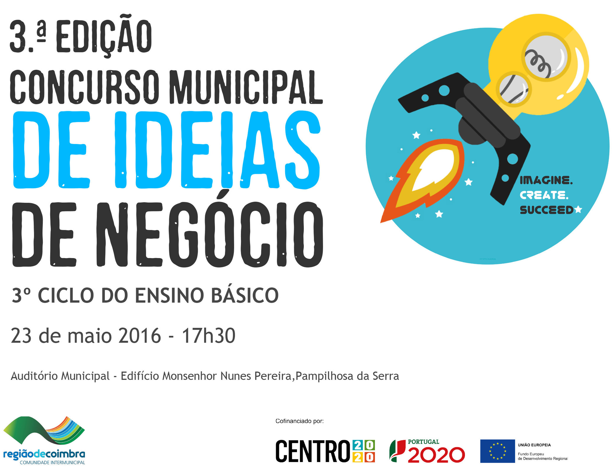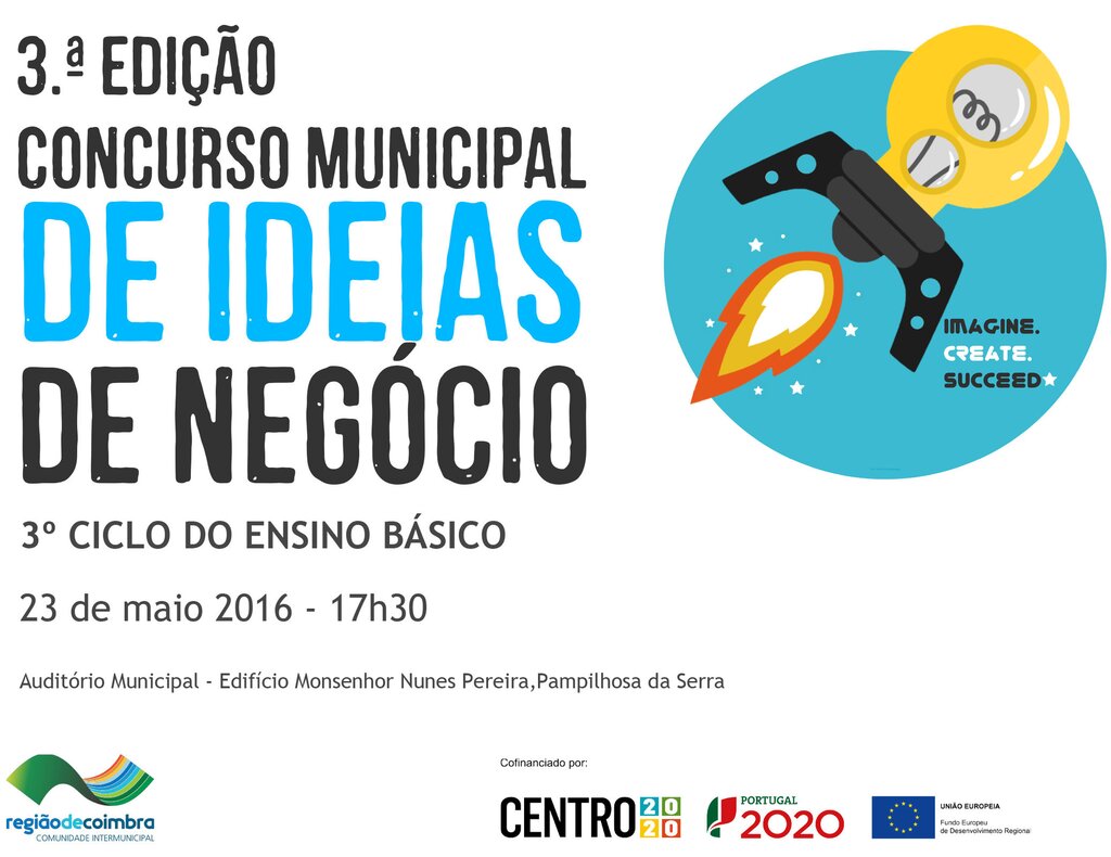 Com o objetivo de criar uma cultura empreendedora, promover o espírito de iniciativa, de cooperação e criatividade, e permitir aos jovens uma experiência real e válida na área do empreendedorismo, terá lugar, mais uma vez, no concelho o Concurso Municipal de Ideias de Negócio – 23 maio, conducente à 3ª edição do Concurso Intermunicipal de Ideias de Negócio – 4 junho, na qual a Pampilhosa estará novamente representada, por alunos do 3º CEB.