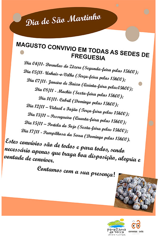 O Programa Conversa de Avós promovido pelo Município de Pampilhosa da Serra, em parceria com todas as Juntas de Freguesia, irão organizar em todas as freguesias um magusto convívio, no âmbito das Comemorações do Dia de São Martinho.