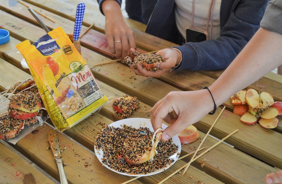 À tarde, no recinto escolar, coube a 20 alunos do 7ºano, prosseguir os trabalhos de valorização das micro estações de biodiversidade instaladas no Agrupamento de Escolas, através das construção e instalação de alimentadores de aves, com recurso a duas técnicas distintas: alimentadores artificiais com recipiente (embalagens instaladas em árvores) e alimentadores artificiais sem recipiente (junção de alimentos suspenso nos ramos de árvores).