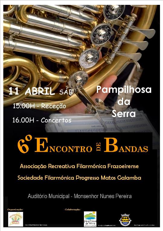 Seguindo a programação anual de atividades musicais do Grupo Musical Fraternidade Pampilhosense, este vai levar a efeito no próximo dia 11 de abril, pelas 16.00h, no Auditório Municipal Monsenhor Nunes Pereira - Pampilhosa da Serra, o 6º Encontro de Bandas.