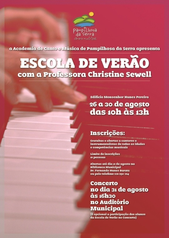 A Academia de Canto e Música de Pampilhosa da Serra promove, de 26 a 30 de agosto, uma Escola de Verão, aberta a todos os que ambicionem iniciar ou aprofundar conhecimentos musicais ao nível do canto ou ao nível de determinados instrumentos musicais.