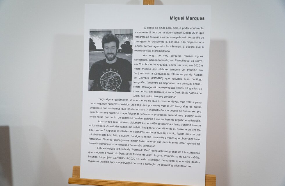 Segundo Rui Simão, Vereador da Câmara Municipal de Pampilhosa da Serra, a exposição, que pode ser vista até ao final de abril, espelha a forma pura com que o céu, “ativo singular que tem vindo a ser protegido à escala planetária”, se apresenta nestes 3 concelhos. “O céu noturno é um ativo e uma motivação para toda a humanidade”, considerou, acrescentando que na Pampilhosa da Serra, em particular, “pela ausência de poluição luminosa”, “está disponível para ser contemplado quer à vista desarmada quer quando alguém reúne condições técnicas que lhe permita chegar um pouco mais longe”.