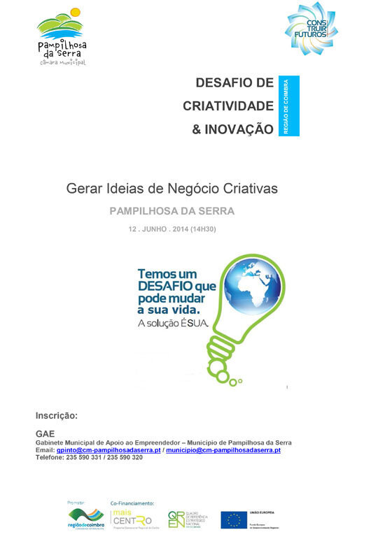 A Comunidade Intermunicipal da Região de Coimbra em parceria com a Câmara Municipal de Pampilhosa da Serra irá promover no dia 12 de junho de 2014, pelas 14h30, no Edifício Monsenhor Nunes Pereira o I Desafio de Criatividade & Inovação - Gerar Ideias de Negócio Criativas.