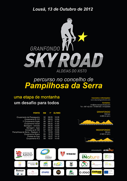 Numa parceria entre o Município de Pampilhosa da Serra, o Turismo Centro de Portugal, a ADXTUR, o VILLA PAMPILHOSA HOTEL, os Bombeiros Voluntários de Pampilhosa da Serra, a GNR e o Clube de BTT "Os Cremalheiras Empenados, decorrerá no próximo dia 13 de outubro o GRANDFONDO SKY ROAD ALDEIAS DO XISTO.