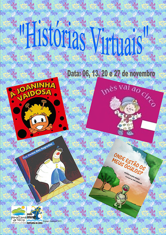 Assim, e nos próximos dias 6, 13, 20 e 27 de novembro, o Espaço de Internet vai proporcionar às crianças da Ludoteca "Pampilho" que entrem no mundo da fantasia. Esta atividade consiste no visionamento de histórias virtuais, e seguidamente cada criança pinta, online, um desenho alusivo ao tema, dando asas à imaginação para colorirem o seu trabalho.