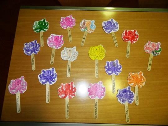 Depois de conhecerem a história e de terem visualizado as imagens lindíssimas do fundo do mar, cada criança construí o seu marcador de livros com o polvo coceguinhas.