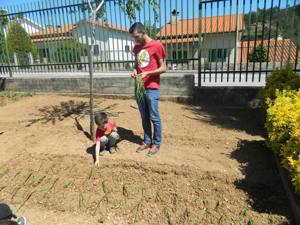 Nesta atividade, que teve como objetivo promover hábitos alimentares saudáveis e fomentar o contacto com a agricultura biológica, os alunos plantaram morangos, cebolos, couves e tomates.