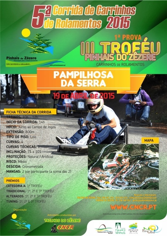 No próximo domingo, dia 19 de abril, arranca em Pampilhosa da Serra o III Troféu Pinhais do Zêzere em carrinhos de rolamentos. Um troféu composto por quatro provas integradas no Campeonato Nacional de Carrinhos de Rolamentos (CNCR) - 2015.