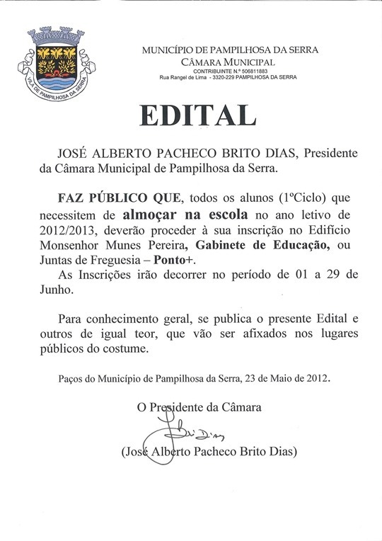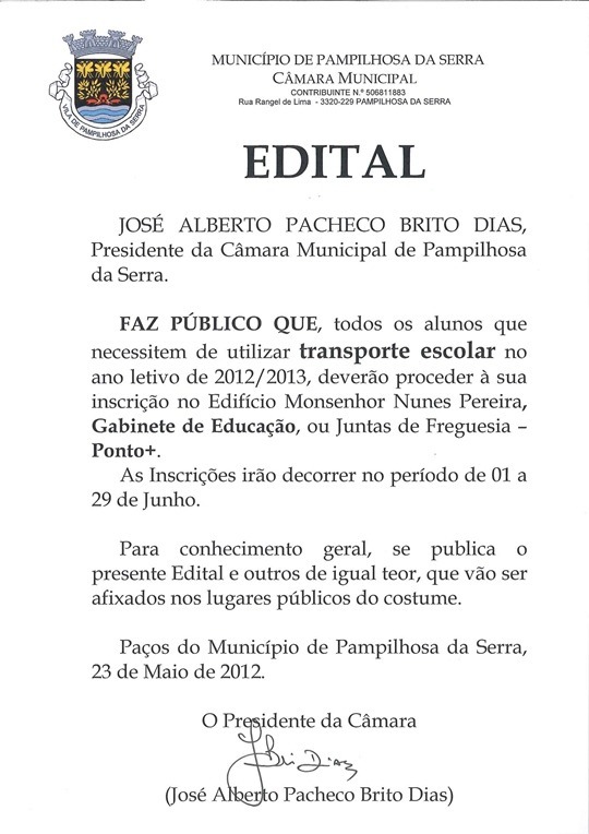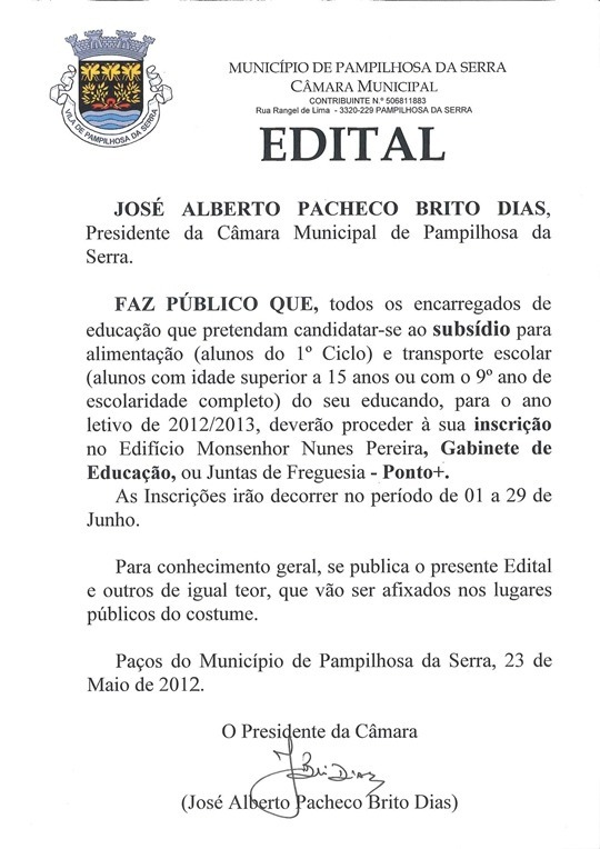O Município de Pampilhosa da Serra, vem através deste meio informar toda a população escolar que as inscrições para Transporte, Alimentação e Subsidio para o ano letivo de 2012/2013, irão decorrer de 01 a 29 de junho, no Gabinete de Educação - Edifício Monsenhor Nunes Pereira e em todos os Pontos+ das freguesias deste concelho.
