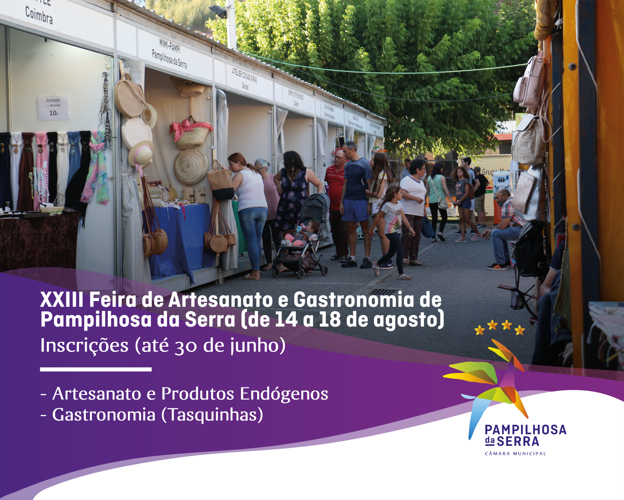 ✅ Até ao dia 30 de junho, estão abertas as inscrições para expositores (artesanato e produtos endógenos) e tasquinhas, no âmbito da XXIII Feira do Artesanato e Gastronomia que se realiza de 14 a 18 de agosto, na Praça do Regionalismo, na Vila de Pampilhosa da Serra.