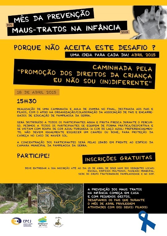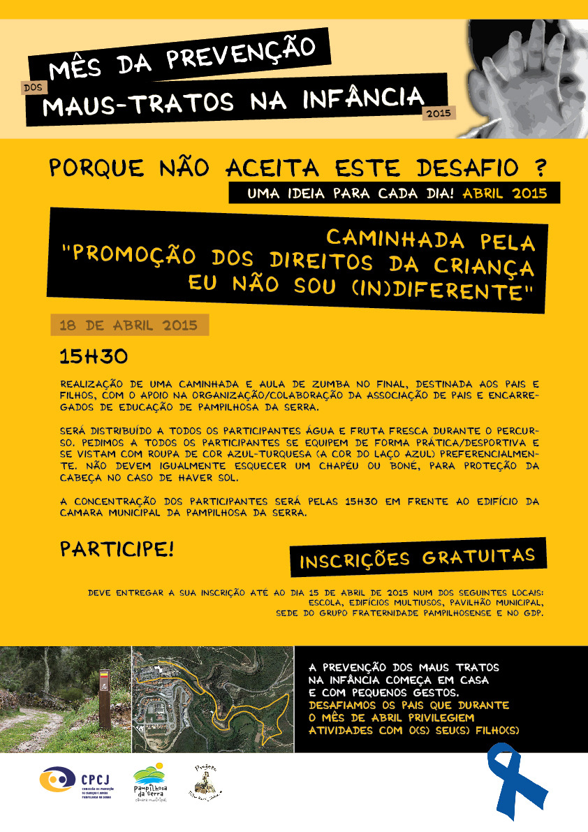 No próximo dia 18 de abril 2015 (15h30) a CPCJ de Pampilhosa da Serra dinamiza uma Caminhada e aula de zumba pela "Promoção dos Direitos da Criança - eu não sou (In)diferente" em estreita colaboração com todas as entidades parceiras da CPCJ, com especial destaque para, o Município de Pampilhosa da Serra, o Agrupamento de Escolas Escalada, Pampilhosa da Serra, o Projeto Trilhos Rur@al_idades e Associação de Pais e Encarregados de Educação de Pampilhosa da Serra.