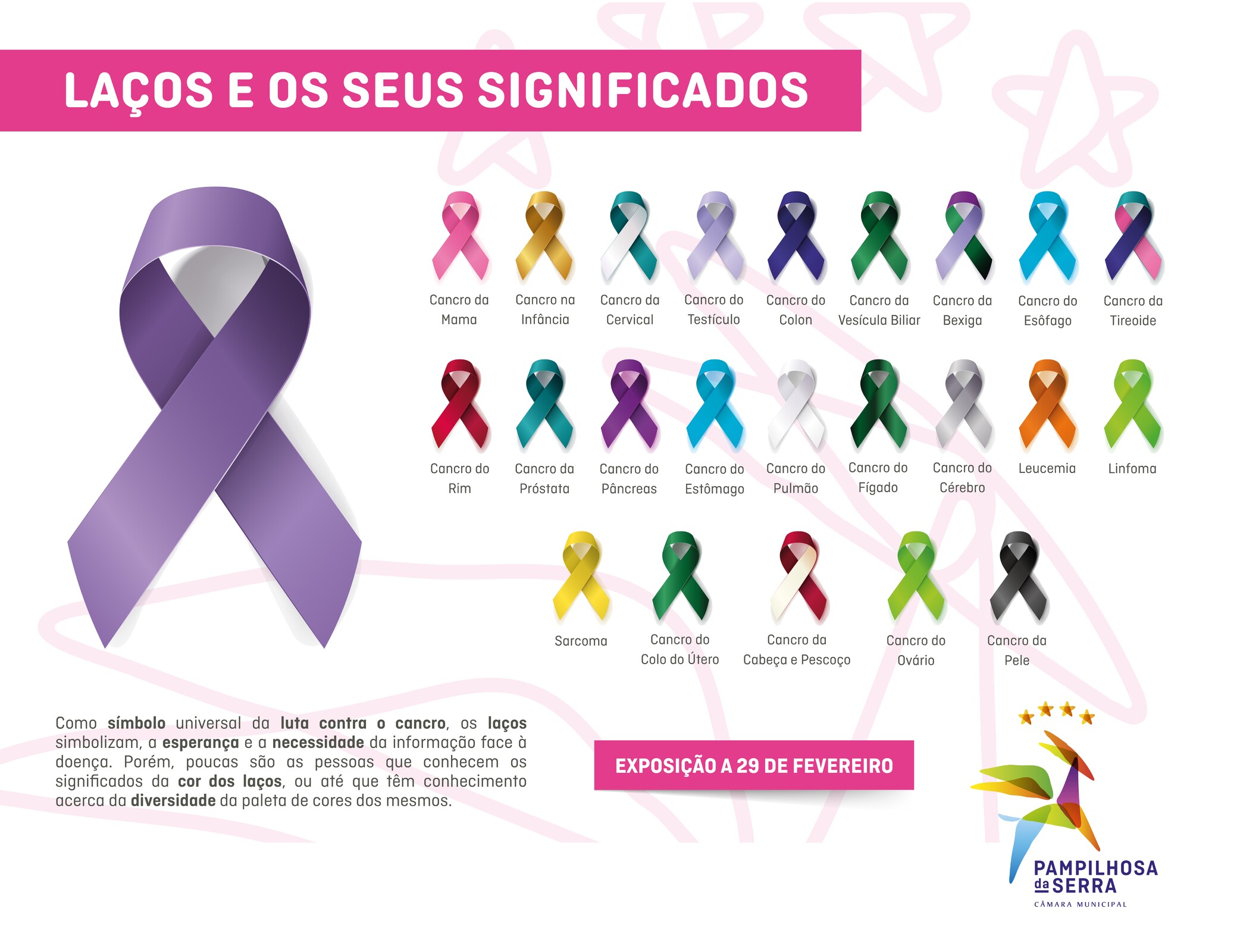 A Câmara Municipal juntou-se, mais uma vez, a esta causa e lançou o desafio às Instituições Locais e Juntas de Freguesia do Concelho, de construírem um laço de cores diferentes (associadas, a nível nacional, a cada tipo de cancro), para no dia 29 de fevereiro serem expostos, como forma se sensibilizar e informar para a importância da prevenção e diagnostico precoce.