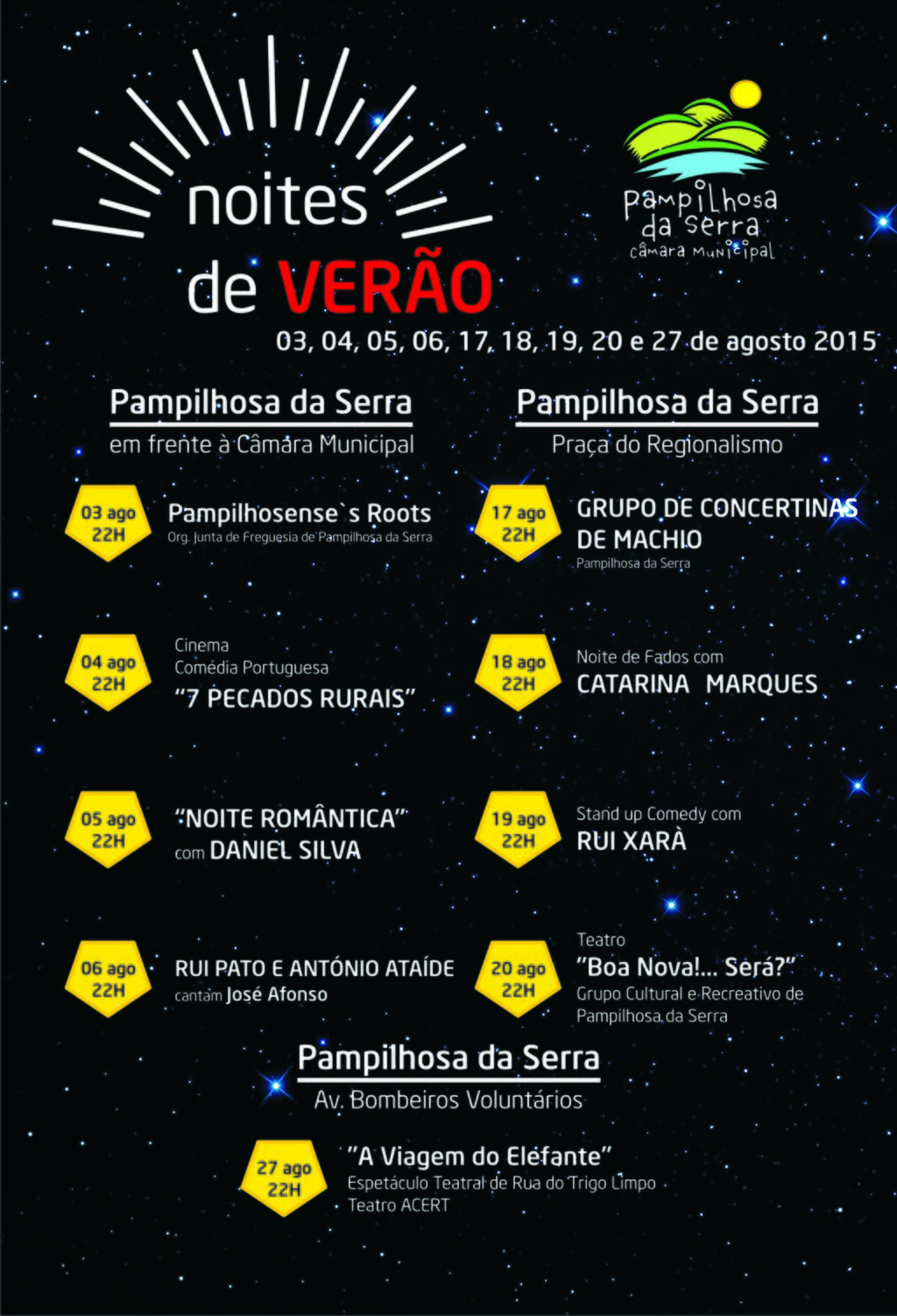 O Município de Pampilhosa da Serra vai promover mais uma edição da animação «Noites de Verão». Um evento que decorrerá de 3 a 6, de 17 a 20 e a 27 de agosto, mesmo no centro da Vila de Pampilhosa da Serra.